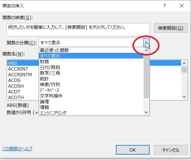 関数の挿入画面が開いたら、関数の分類にある▼をクリック→「数学/三角」をクリック、