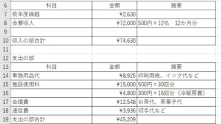 サンプルでは収入は会費のみなのでそのまま入力していただいてもいいのですが、集計の計算式の入れ方を説明するためにSUMIFを使った集計をやってみます。