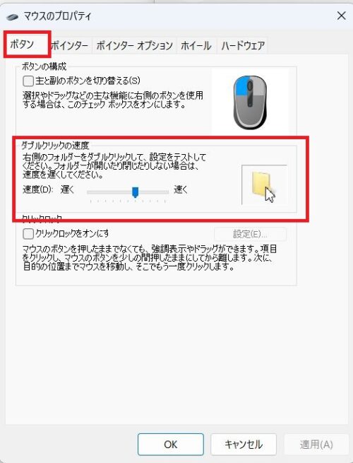 「マウスのプロパティ」画面で「ボタン」タブが選択されていることを確認、ダブルクリックの速度にあるスライダーを調整します。