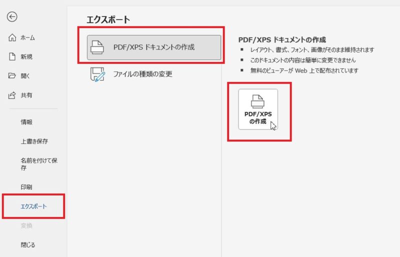 Wordで作成したファイルを開き、「ファイル」をクリック、「エクスポート」をクリック、「PDF/XPSドキュメントの作成」が選択されていることを確認、「PDF/XPSの作成」ボタンをクリックします。