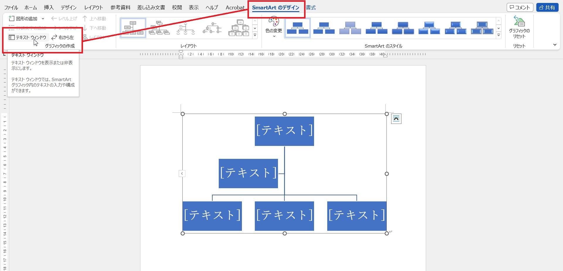 組織図に入っているすべての文字を削除するには、組織図を選択していると表示される「テキストウィンドウ」の中でクリックしてカーソルを置いた状態にし、キーボードのCtrlキーを押しながらAキーを押し(すべて選択するショートカットキー)、キーボードのDeleteキーを押してすべての文字を削除します。