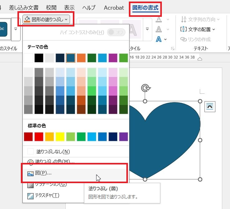 次に、挿入したハートを選択した状態で、「図形の書式」タブにある「図形の塗りつぶし」をクリック、「図」をクリックします。