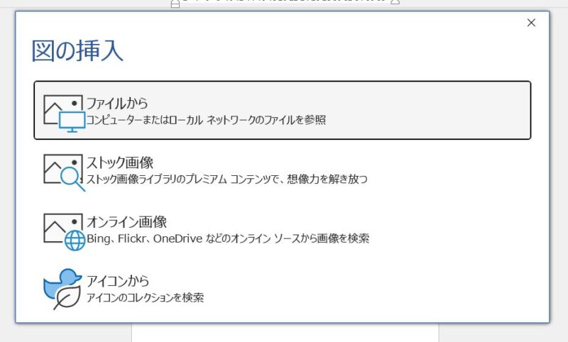 図の挿入画面が開くので、「ファイルから」をクリック、写真を保存した場所を開き、挿入したい写真を選択して挿入します。