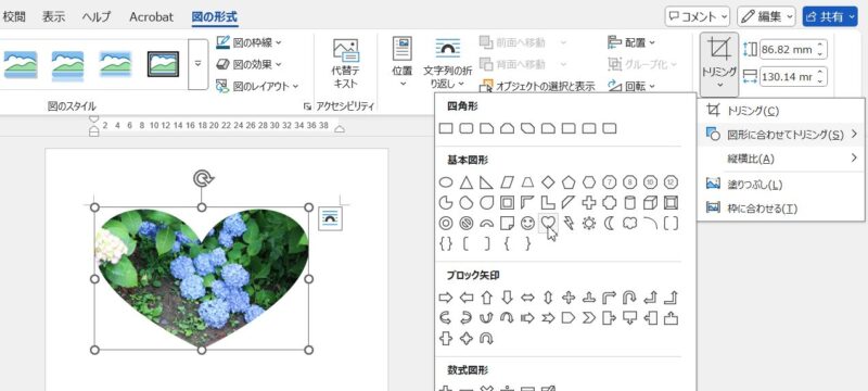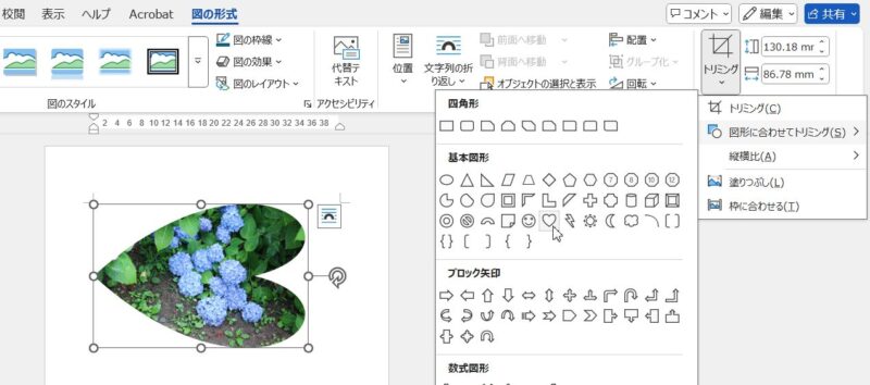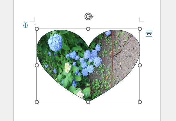「図形に合わせてトリミング」にある「ハート」が横を向くのかと別の写真を挿入してやってみたところ、ちゃんとハートの形で切り抜かれています。