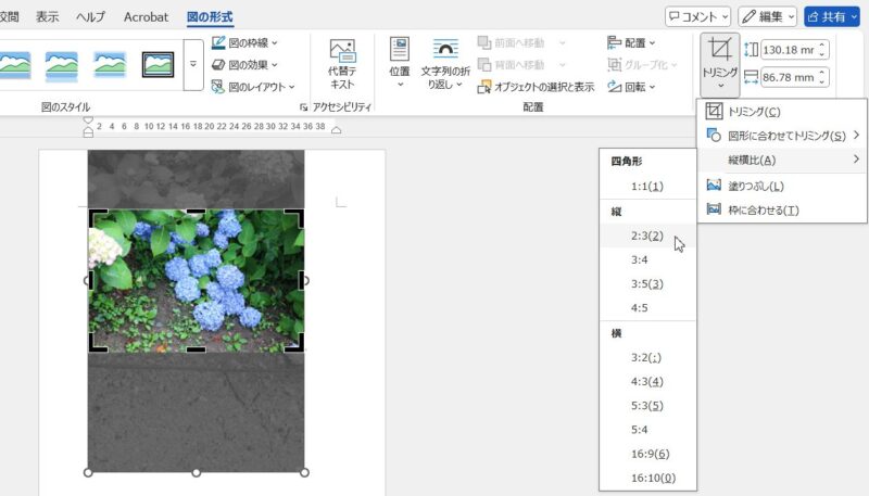 縦置きの写真を選択した状態で、「図の形式」タブにある「トリミング」下の▼をクリック、「縦横比」→縦「2:3」をクリックし、幅と高さの比率を変更します。