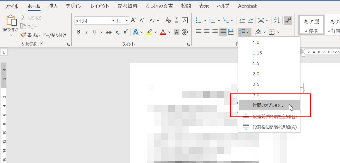 表の下の改行マークの辺りをクリックしてカーソルを置き、「ホーム」タブにある「行と段落の設定」ボタンをクリック→「行間のオプション」をクリックします。
